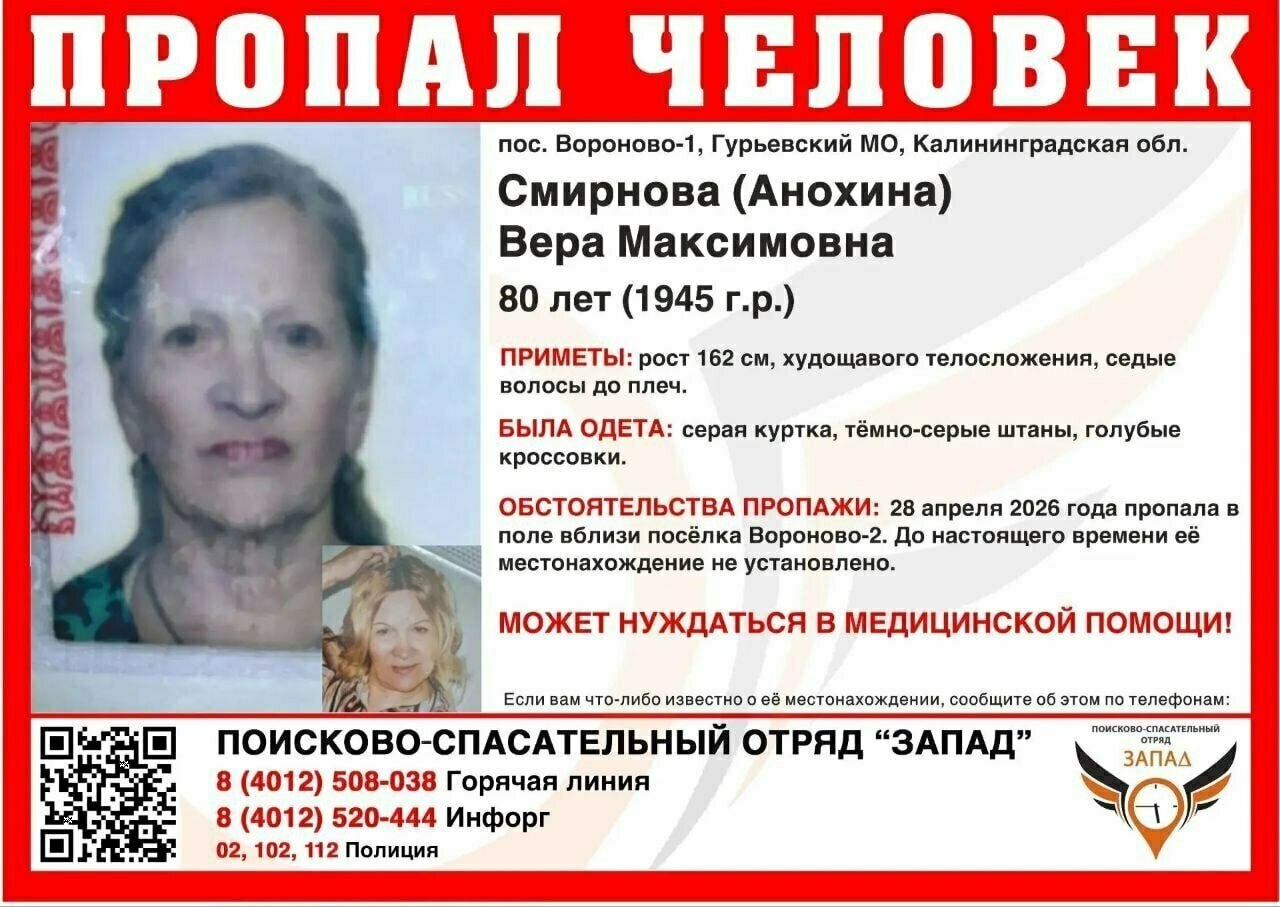Пенсионерка не выходит на связь со вторника, 28 апреля. Последний раз её видели в поле вблизи посёлка Вороново-2 Гурьевского района. Пожилая женщина может нуждаться в медицинской помощи.